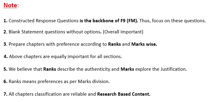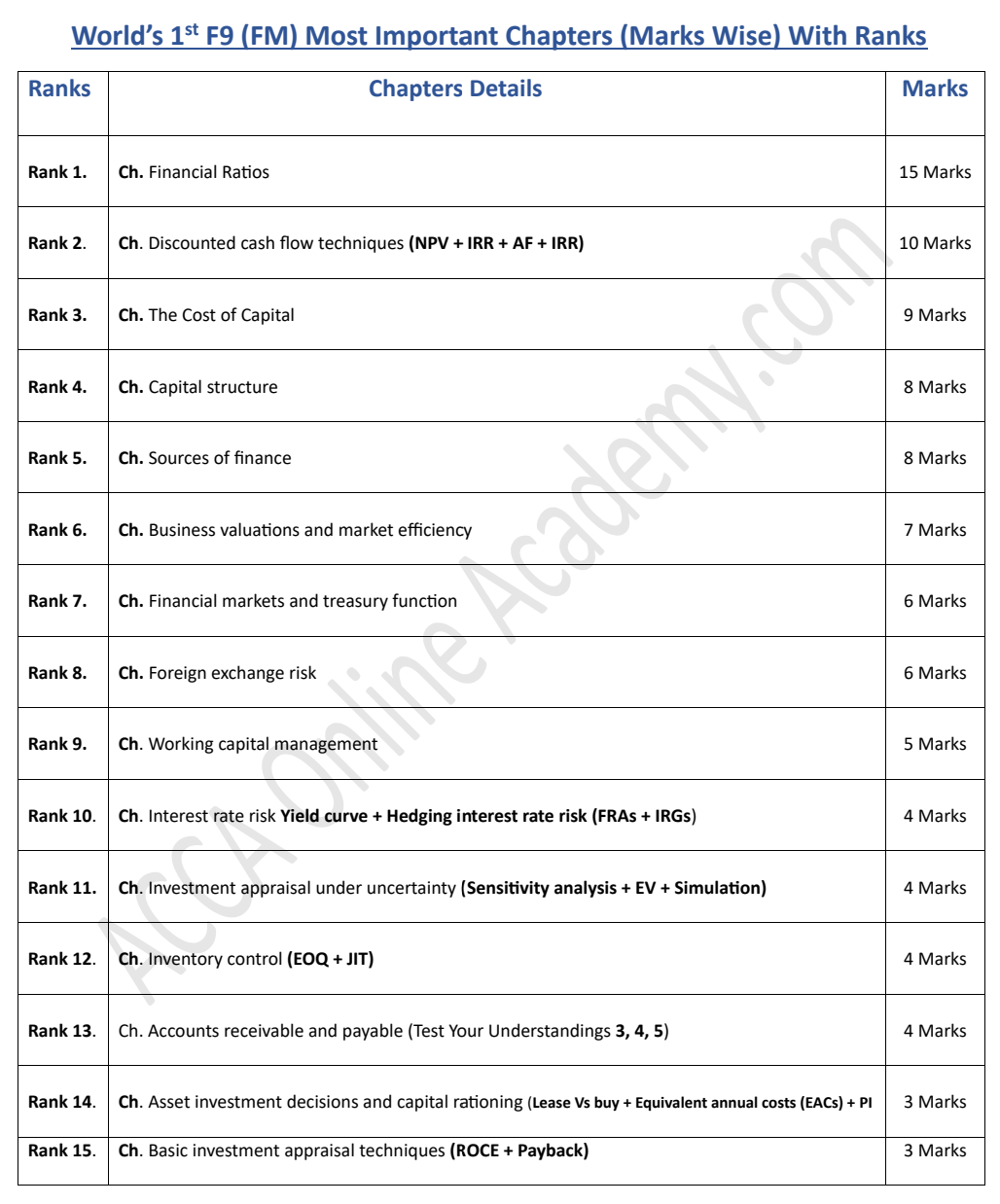 In ACCA F9 (FM) Paper, we reveal the secret of all important chapters with ranks and marks wise modest description as per exam requirements. We believe that Ranks describe the authenticity and marks explore the Justification.