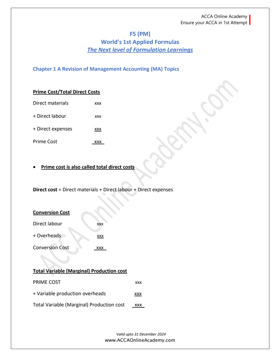 F5 (PM) Applied Formulas Notes gives the ace remarkable experience to the students for strengthen the numerical questions. In which, we explain all formulas chapterwise and elaborate in the professional way. Moreover, all required formats are also given in the notes. Formulas notes is the backbone of your concerned paper and secure your exam attempt. In this section, you can get notable worthy Formulas notes at the most affordable prices to click on the following button: